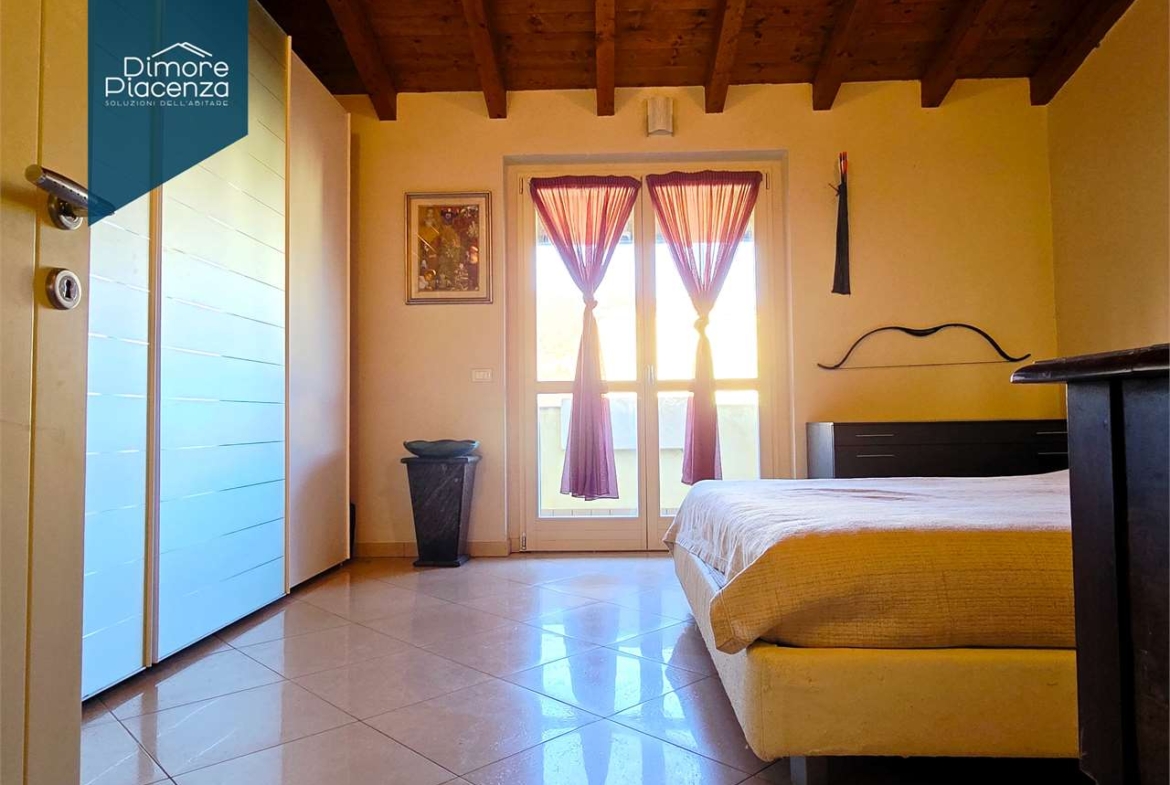 L’interno, distribuito su due piani, offre un ampio soggiorno con cucina a vista, due camere da letto e un bagno con doccia al piano giorno. Al piano superiore, si trovano altre due camere da letto (di cui una con ulteriore locale comunicante), un bagno con vasca e doccia, e un balcone che si affaccia sulla campagna circostante.